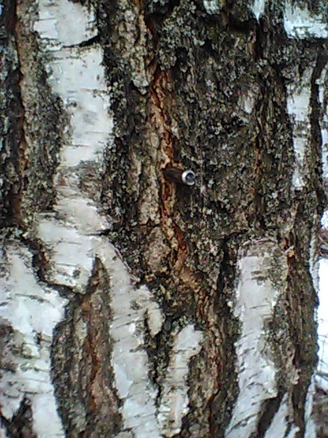 Сверлом на 7 сверлю отверстие на глубину 1.5 - 2 сантиметра от уровня коры. В отверстие плотно забиваю топором нержавеющую трубку. Ниже в кору (не затрагивая ткани дерева) закручиваю крюк для крепления бутылки - 5 кг свободно держит. Никаких дополнительных креплений для бутылки не использую - просто вешаю ее с подветренной стороны дерева - у нас практически всегда западные ветра, поэтому дополнительное крепление излишне.